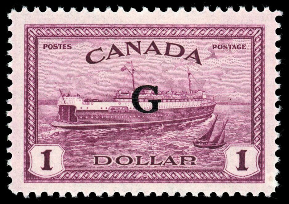 Transbordeur, "G" surimprimé. 1$. Timbre du Canada surimprimé officiel O25 de l'émission de la paix et ressources naturelles.
