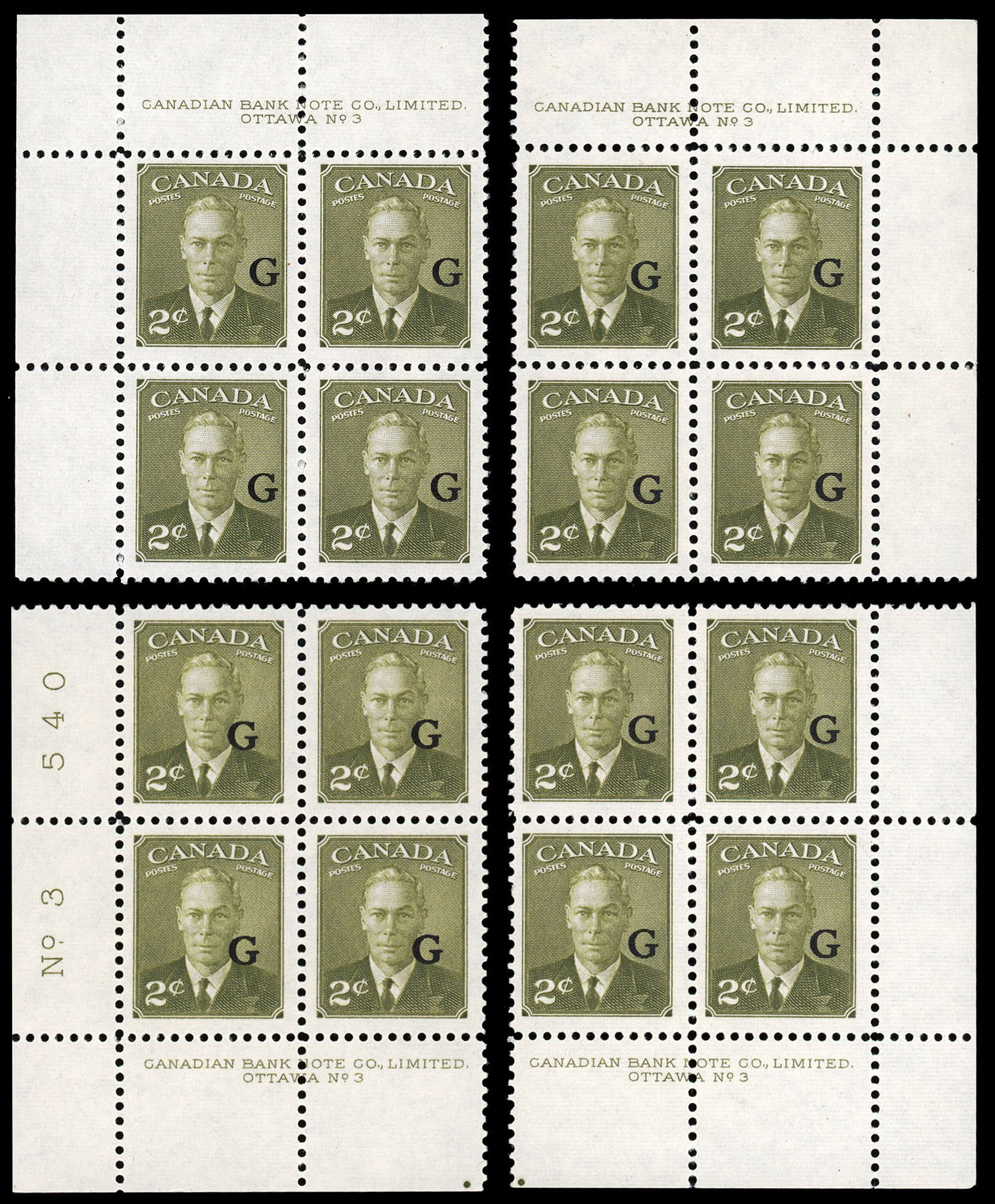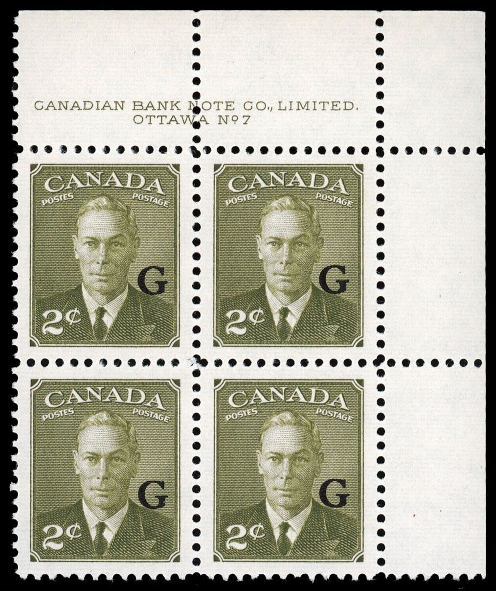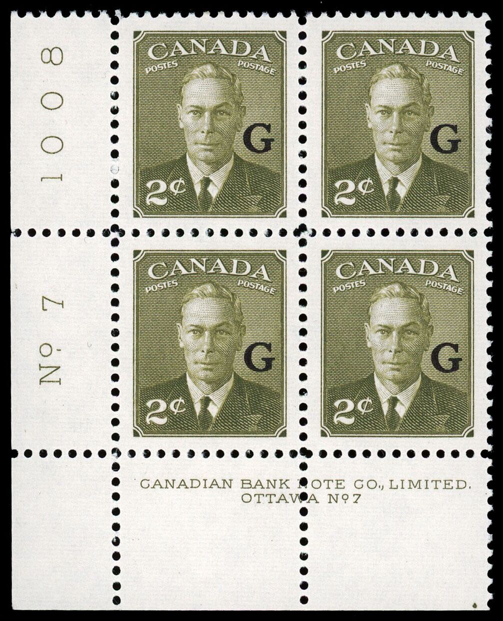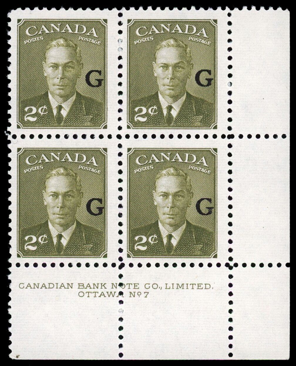 King George VI, "G" surimprimé - Vert Olive. 2¢. Timbre du Canada surimprimé officiel O28 de l'émission d'usage courant.