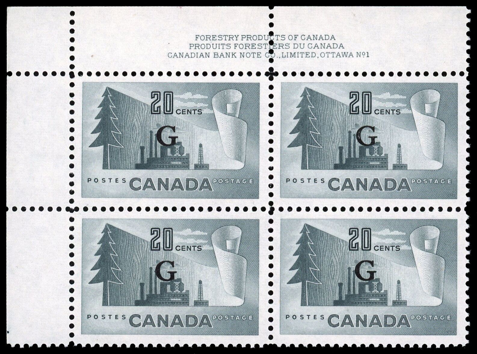 Pulpe et moulin à papier, "G" surimprimé. 20¢. Timbre du Canada surimprimé officiel O30 de l'émission d'usage courant.