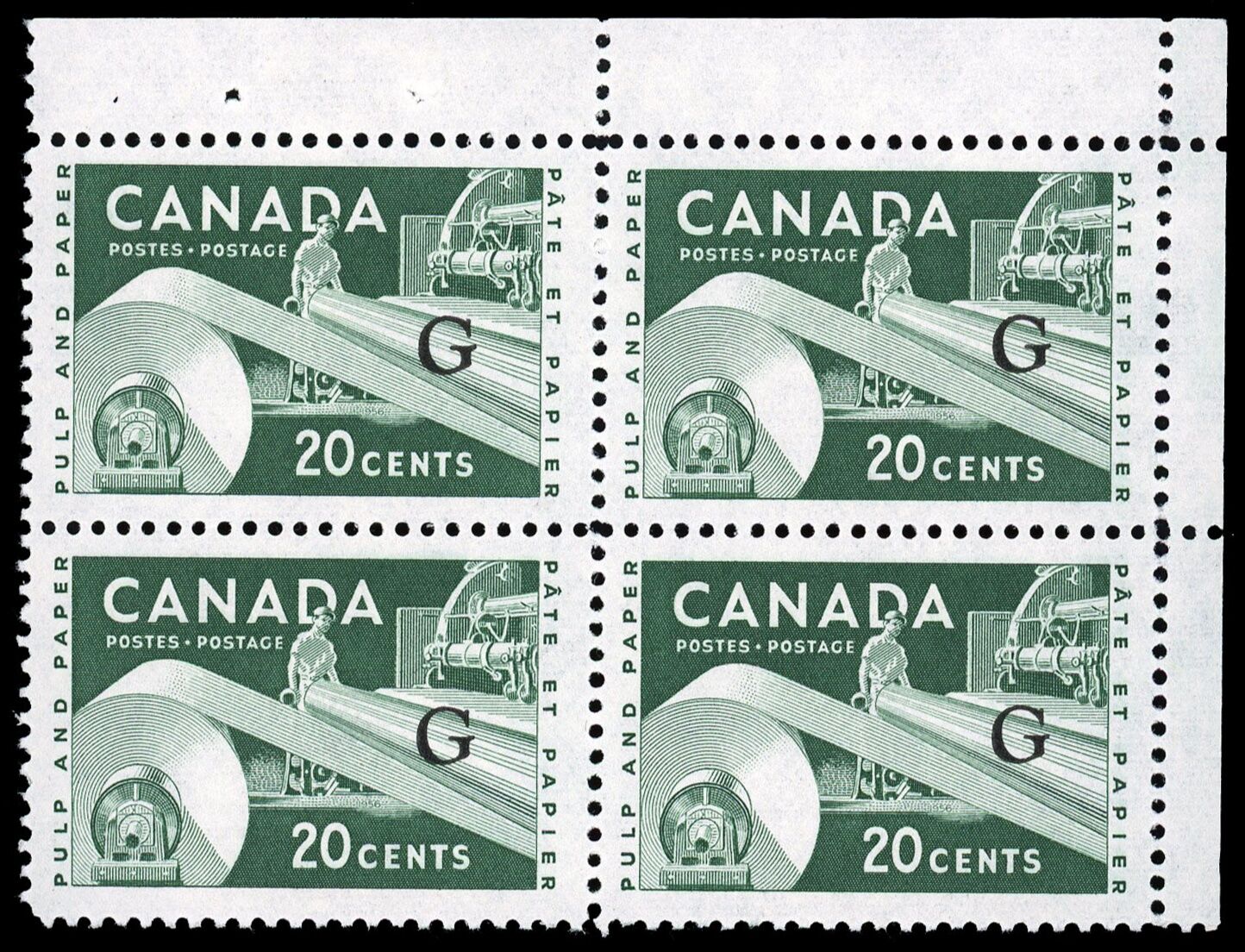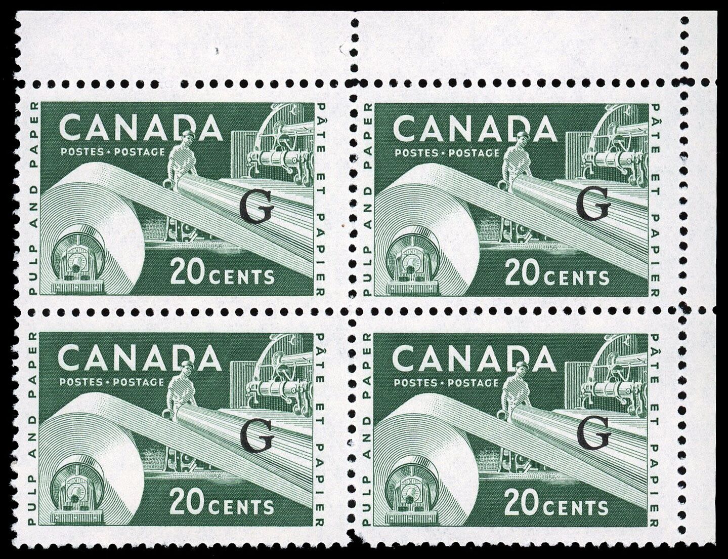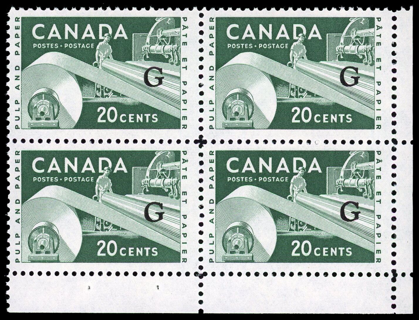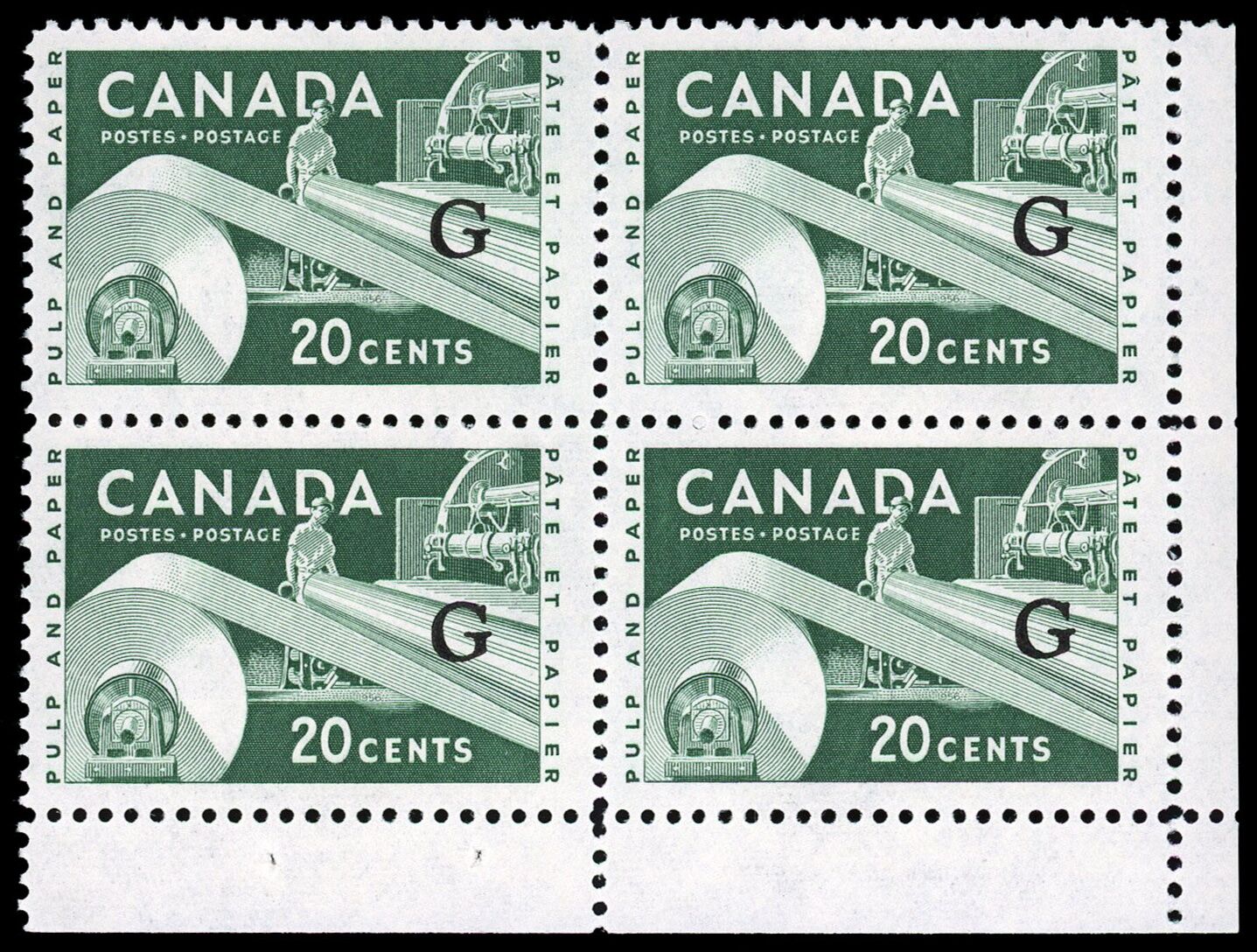 L'industrie de papier 20 ¢ avec surimpression « G volant » fut a grande majorité imprimée sur feuille sans inscription, ce qui explique pourquoi les blocs de coin sont officiellement répertoriés au catalogue pour cette émission !