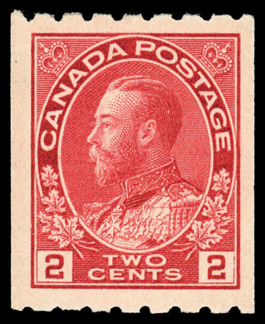 Rare timbre du Canada n° 124, 2 ¢, Roi George V, « Amiral », en roulette – Neuf - Très Bien, avec une très légère trace de charnière. Une excellente façon d'obtenir ce timbre rare sans avoir à payer l'énorme prime sans charnière !