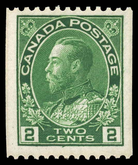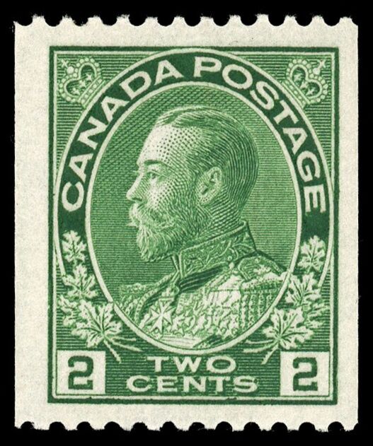 Très beau et frais timbre en roulette, neuf - Très Bien avec charnière transparente #133 King George V "Amiral" (1924) 2¢. Excellent moyen d'obtenir ce timbre coûteux sans avoir à payer l'énorme prime Sans Charnière.