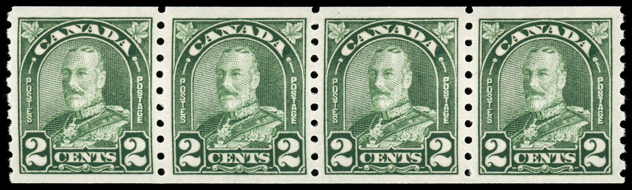 Roi George V-4x2¢, vert mat. Bande de 4. Émission Timbres en roulette du Roi George V, « Feuille d'Érable » ou « Arche».