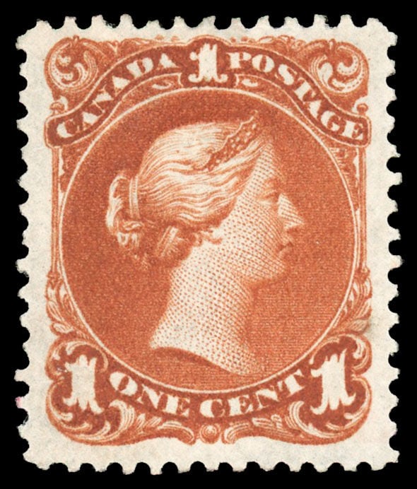 Reine Victoria, one cent, rouge brun, papier mince, 1¢, de l'émisssion des Grandes Reines.